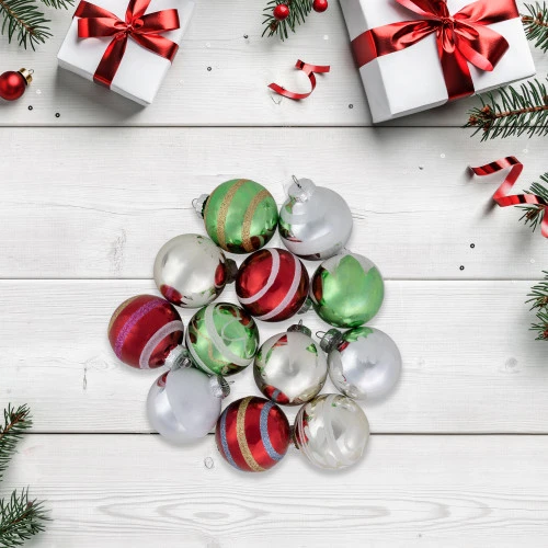 - Ornaments come in shiny silver, green, red, and gold