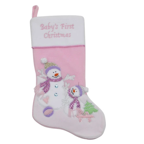 - The stocking reads Babys First Christmas; Comes ready to hang on a pink velvet loop