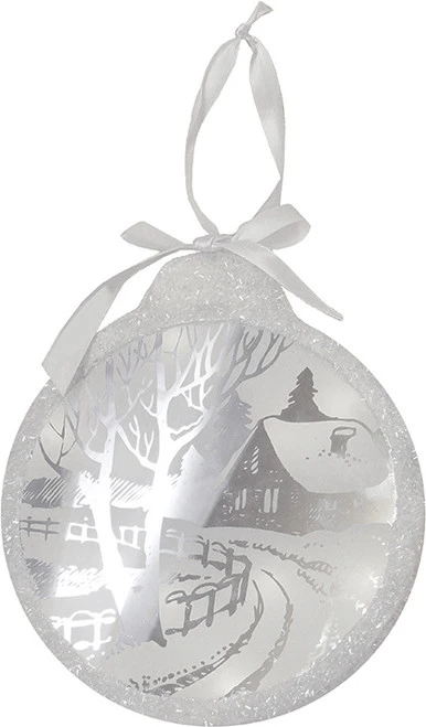 Featuring a round ornament with a wintry, cottage scene etched in the mirror and backlit with clear LED lighting