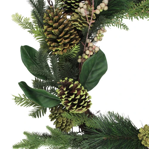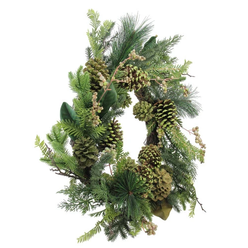 Features an artificial mixed pine lush wreath with lifelike greenery with berries and pine-cones with tips