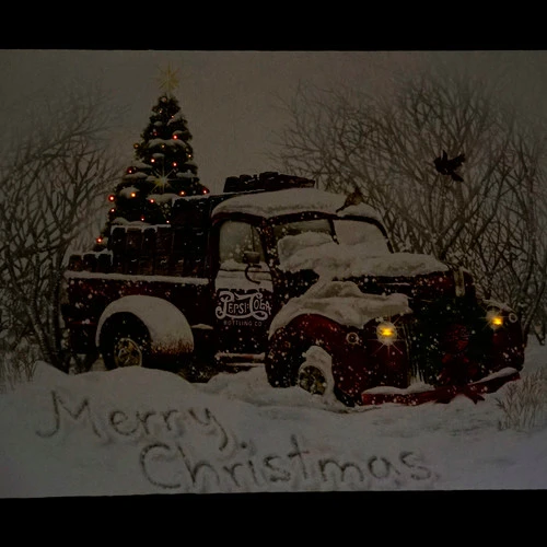 Retro Pepsi delivery truck with a bed full of gifts outside a decorated house