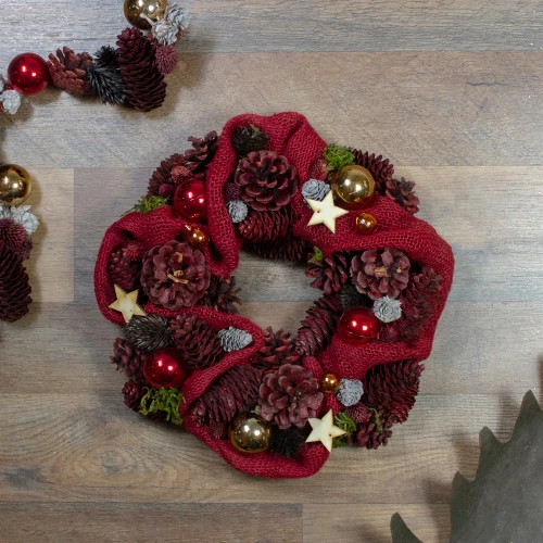 This beautiful wreath will add a warm touch to your door, wall or window for the holidays. If features a beautiful pine cone wreath with red burlap, wooden stars, ball ornaments, and artificial moss. This wreath works perfectly at home or at the office, bringing a bit of holiday cheer wherever you go.